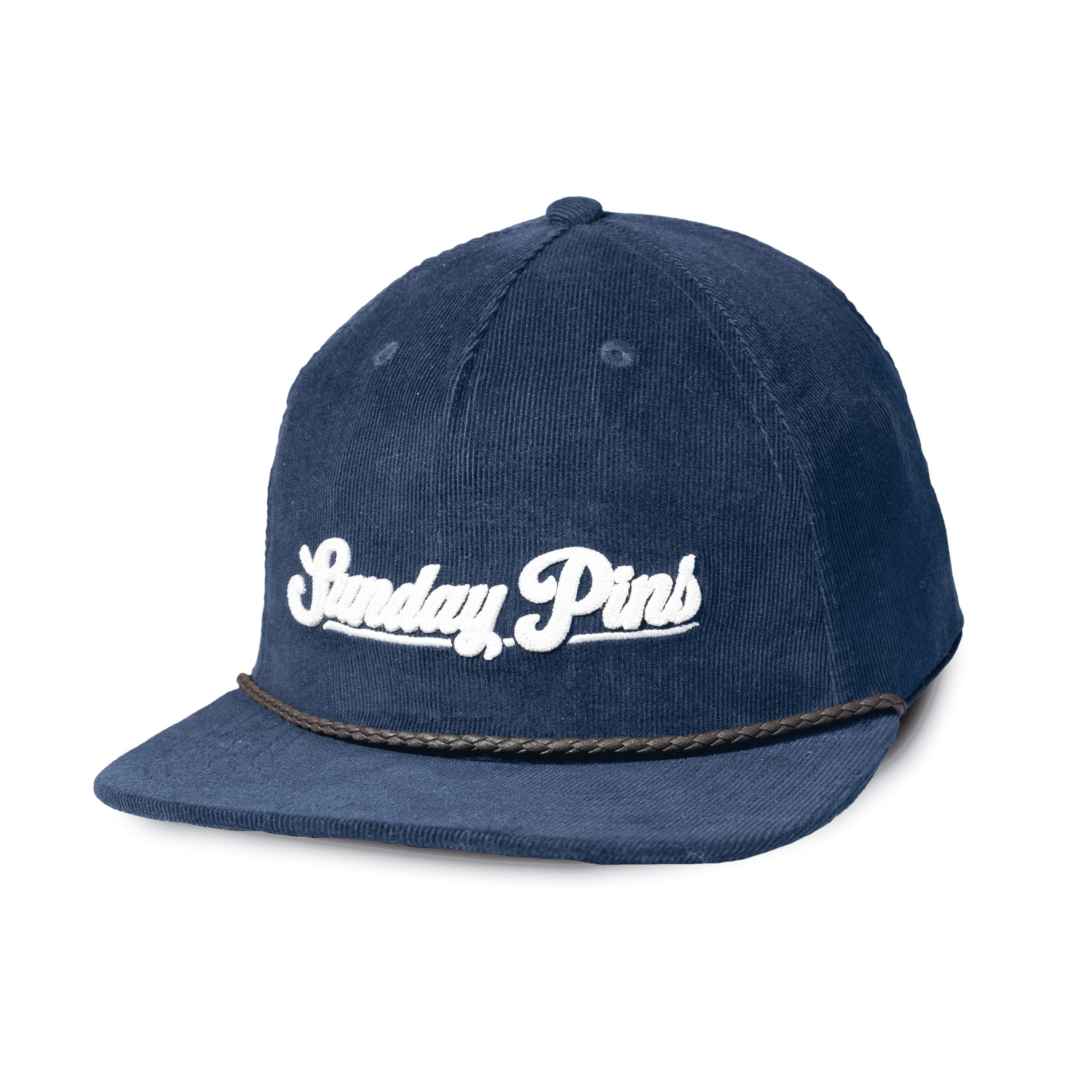 El bordado frontal en color blanco con el logo “Sunday Pins” aporta un contraste llamativo y elegante, mientras que el detalle de cuerda decorativa en la base de la visera añade ese toque vintage que marca la diferencia.
